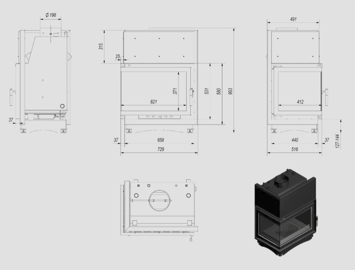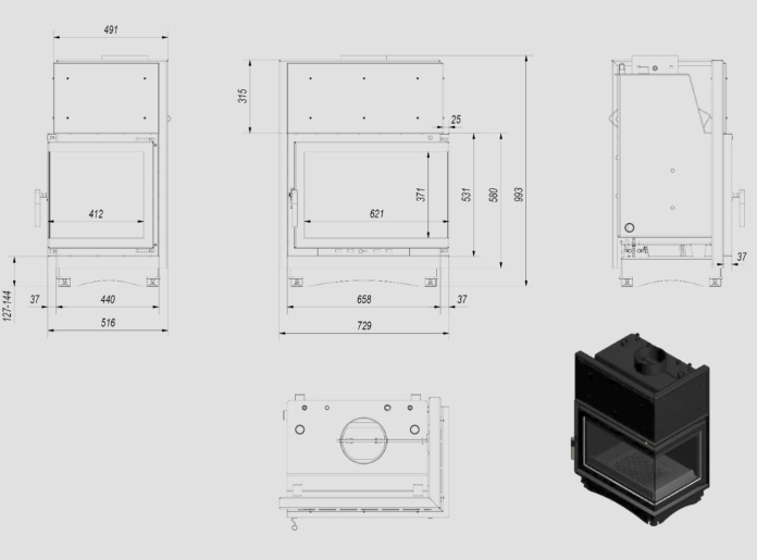Kominek z płaszczem wodnym KRATKI ZUZIA prawy/lewy 12 kW Ø 200